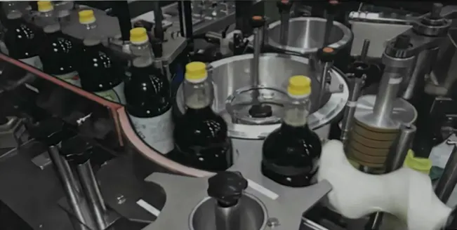 ここでは紙ラベルとシュリンクラベルの貼付に併せてキャップの供給と過熱殺菌(キャップ)と過熱充填したつゆの冷却作業をしています。