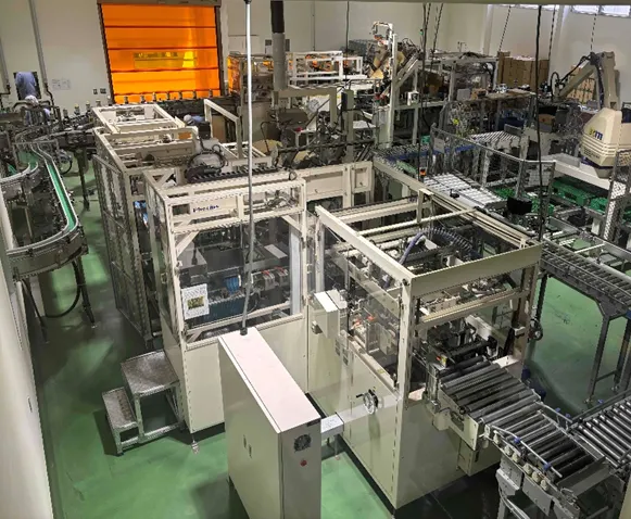 充填完了後、自動で段ボールに梱包され、ロボットアームによるパレットの積み上げ作業まで行います!