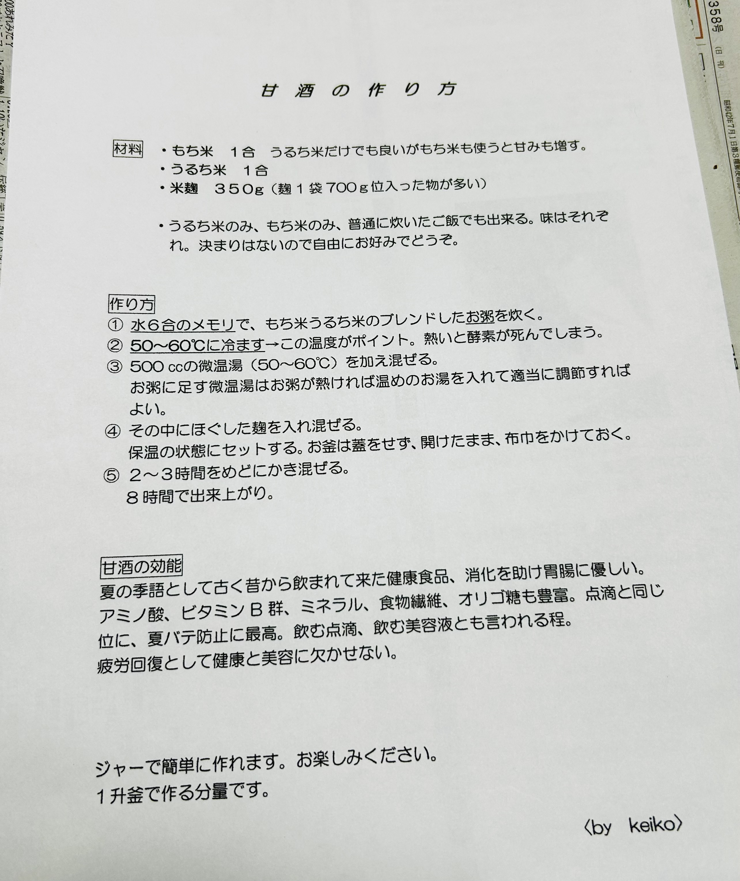 トップ > みんなのくらし《写真投稿》 > 甘酒レシピ りんごばーば 2025/11/26 23:12 甘酒レシピ 〈甘酒レシピ〉 簡単&美味しい 色々試した中から、私なりにいきついた作り方 麹は色々ある中で、 私はAコープで販売している 長野県産米で作った麹が1番美味しい気がする。 麹によって微妙に味が違う。 ✴︎PS...ピーさん 是非とも作ってみて。 皆さんも。 ✴︎最近は手抜きをして、夜作って、 2〜3時間をメドに撹拌せず、夜2回程かき混ぜた後、朝までそのままで置いて結構だった。 いいね 共有する 共有する X facebook LINE リンクをコピー コメントする 3 件の返信 (新着順) ミュートしたユーザーの投稿です。 投稿を表示 こきよみ 2025/11/28 23:35 甘酒、ヨーグルトメーカーで、作っていましたが、なかなかおいしくできないので、最近作ってないです。 ばーばさんのレシピ、一升炊きですよね。うちのは5合炊きだからむりですね。 いいね 返信する ミュートしたユーザーの投稿です。 投稿を表示 りんごばーば 2025/11/29 00:19 こきよみ 5合炊きなら半分の分量にすればいいんじゃないですか? もし心配だったら2合とか3合で計算(小学校の算数)して作れば出来そうだけど、、、。 ヨーグルトメーカーも保温出来るからいいね。 いいね 返信する ミュートしたユーザーの投稿です。 投稿を表示 こきよみ 2025/11/29 20:25 りんごばーば そうですね、そうすればいいのか! そういう計算は得意です。いろんなところでやってます。 ヨーグルトメーカーでやると、なんか芯があるんですよ。夏場はお湯で薄めるだけだからかより感じます。 いいね 返信する ミュートしたユーザーの投稿です。 投稿を表示 ピー 2025/11/27 17:36 ばーばさん、よくよく読み返してみたけど… これってガス釜?💦 普通の電気炊飯器は蓋しないと起動しません😅 いいね 返信する 他 2 件の返信を表示 ミュートしたユーザーの投稿です。 投稿を表示 りんごばーば 2025/11/27 22:51 ピー ピーさん、お釜再度確認してみてください。 って言うか、、、 ①電気釜でお粥を炊く 私はガス釜でお粥炊く。 この時は勿論蓋しますよ。 ②出来上がったお粥にさらに水分足す。 お粥の温度が重要(50℃〜60℃) そこに麹を入れかき混ぜる。 私は電気釜は保温用に使っています。勿論電気釜でお粥炊いてめよいかもしれませんが、ガス釜でお粥を作っています。 家のガス釜は保温は出来ない。炊くだけなので。 電気釜でできると思うけど、 最近の電気釜は保温も蓋しないと、警告音とか何か反応があって出来ないのかなぁ? 家の電気釜は古いから、保温に蓋開けたままでも使えます。 再度確認してみてください。 お粥炊けないかなぁ? 分量は1升釜なので、5合炊きの電気釜だったら量は半分にしてね。 多少少なめでお粥炊いた方が安全?吹きこぼれてお釜ダメにしても悲しいから。 普通のご飯から甘酒を作る人もいます。 濃い目に出来上がるから、後から飲む時薄めればいいんだけど。 甘酒作りの(保温ができる機能がついている)高い器械買って作っている人もいるけど、蓋しなくて保温できるなら充分、買う必要はないし、 使えないとなると、長時間の保温に炬燵も考えられます。 昔は炬燵で作っていたから(私が子どもの頃、母や祖母が炬燵で作っていた思い出あります) でも、その昔、甘酒の季語は夏、江戸の町を甘酒売りがいた絵があるけど、どうやって保温して作っていたのか気になります。 電気で蓋開けて保温できるできるお釜なら楽なんだけとな〜 いいね 返信する ミュートしたユーザーの投稿です。 投稿を表示 りんごばーば 2025/11/28 01:27 ピー どうしても気になって 検索🔍してみました。 何人も電気釜+このレシピで作っているので。 大丈夫と思います。 甘酒作りの保温は蓋開けて(開けないと甘酒はできません) 普段ご飯の保温は蓋してね。 炊飯は勿論蓋閉めないと無理ですね。 いいね 返信する ミュートしたユーザーの投稿です。 投稿を表示 ピー 2025/11/28 11:32 りんごばーば 蓋開けて保温は試してみてないので試してみます🤭 いいね 返信する ミュートしたユーザーの投稿です。 投稿を表示 りんごばーば 2025/11/28 12:04 ピー 是非試してみてください👋 色々作り方ある中、やってみて私流、これが1番☝️という所に行き着いたものです 〜by keiko(実名)〜 周りの皆が、教えて〜と言うので 何年も前レシピにしてみました📝 ご活用頂ければ幸い。 勿論私流なので、自分の良いやり方に変化させて頂ければ尚嬉しい。 JAマーク品の甘酒が売れないと悲しいかな? いいね 返信する ミュートしたユーザーの投稿です。 投稿を表示 ピー 2025/11/27 10:17 ばーばさん、作ってみたいけど面倒です😅💦 作るには相当の気力がいりそうです😱😱😱 ばーばさん、ご馳走になりに行きますね💕 いいね 返信する ミュートしたユーザーの投稿です。 投稿を表示 りんごばーば 2025/11/27 22:53 ピー 待ってま〜す🤗 welcome❣️ 甘酒飲む為に来る人もいますから。 いいね 返信する
