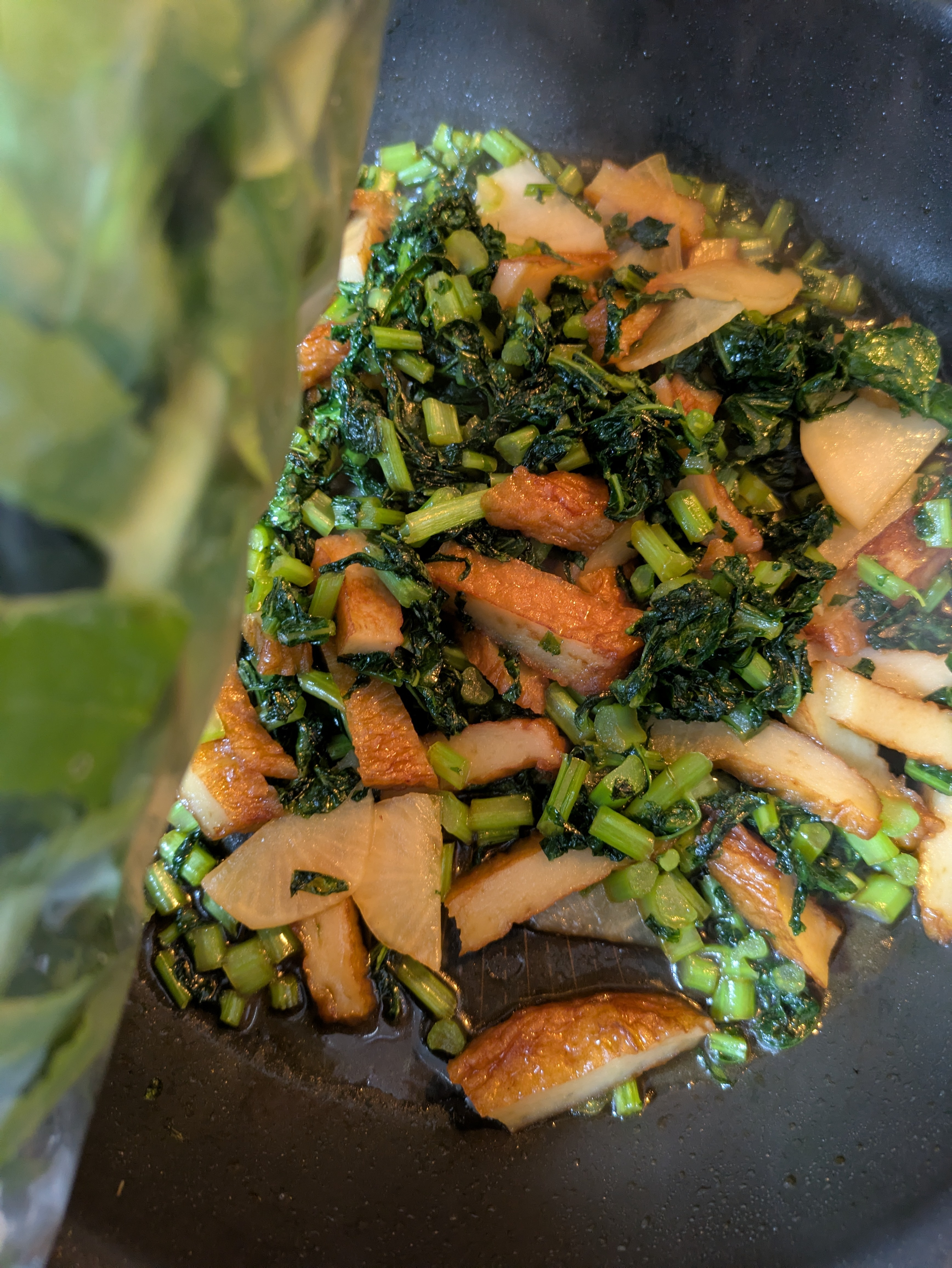 投稿を表示細かく刻んだ大根葉を甘じょっぱく炒め煮にして、白飯にかけて食べるのが大好きなんですが、さつま揚げがはいったらご馳走ですっ!