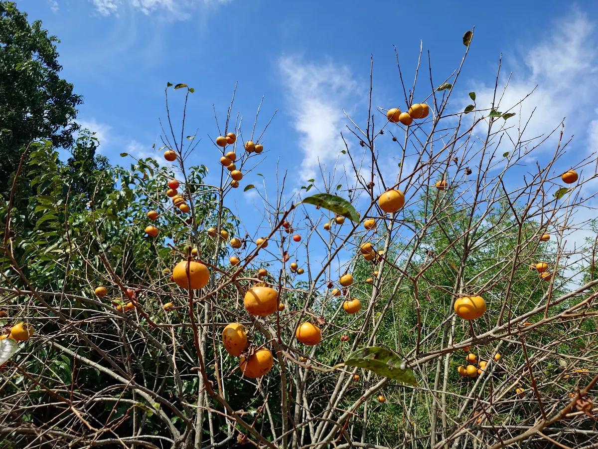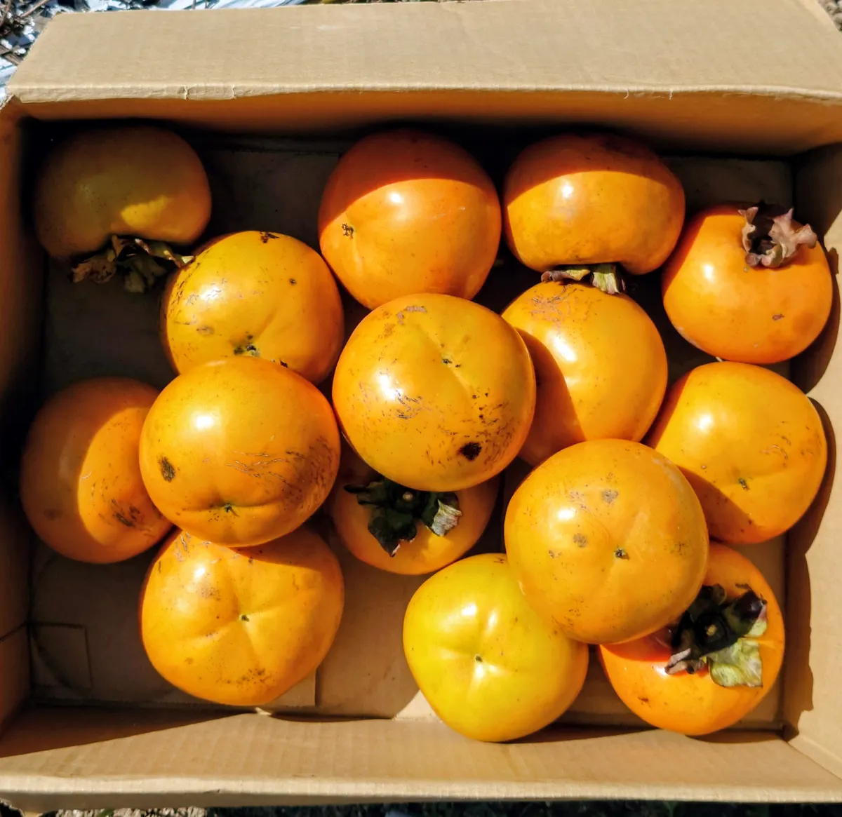 かってない柿に 嬉しくて 背を伸ばし 枝を引いたりして 箱1杯