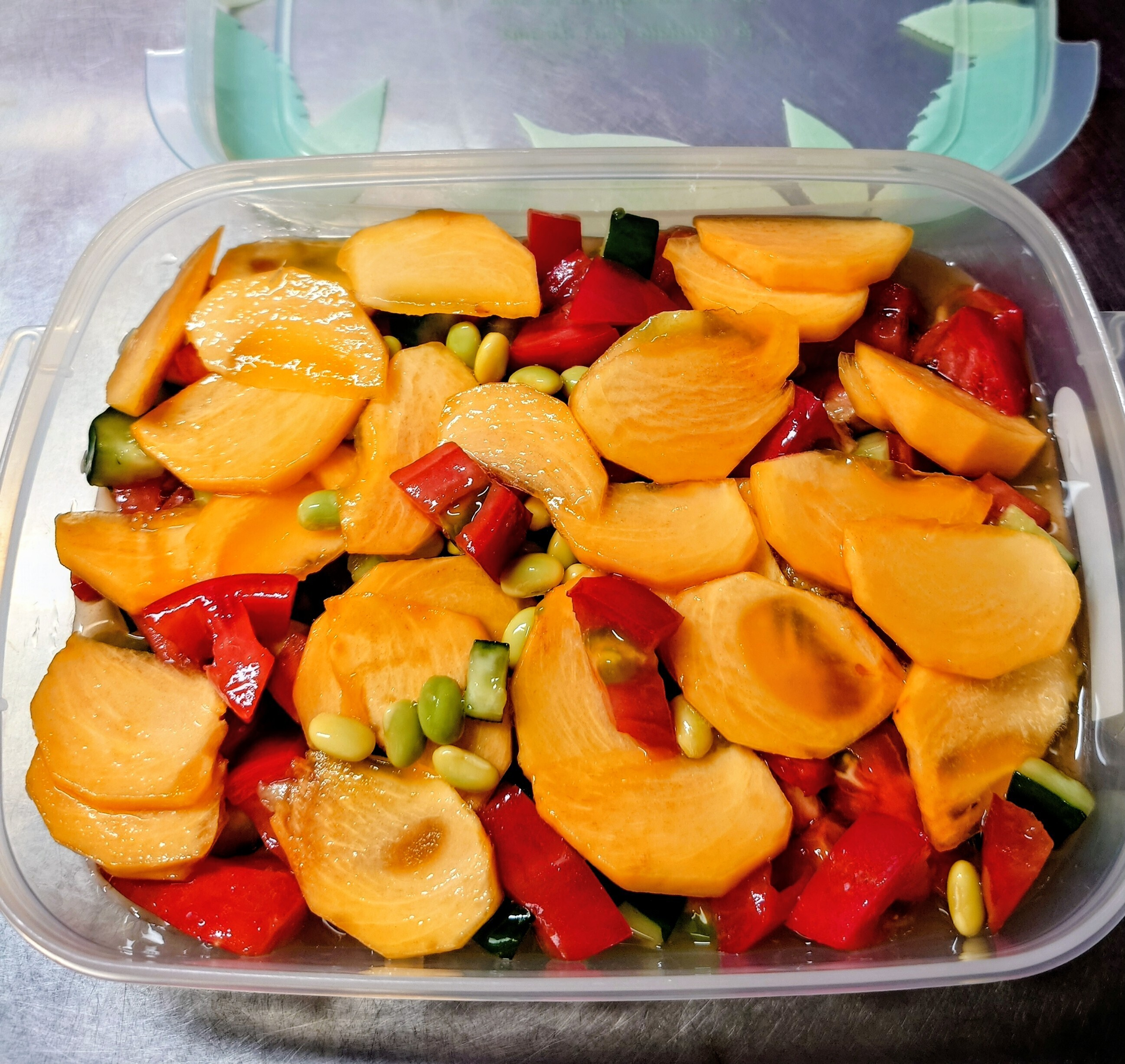 娘のサラダ🥗を真似て 柿 トマト🍅 きゅうり エダマメ をほめられ酢で下ごしらえして 仕上げに黒酢をさ〜つと 入れてみました🎶 きゅうり🥒はサイコロをちょっと 塩もみして ぎゅっと。