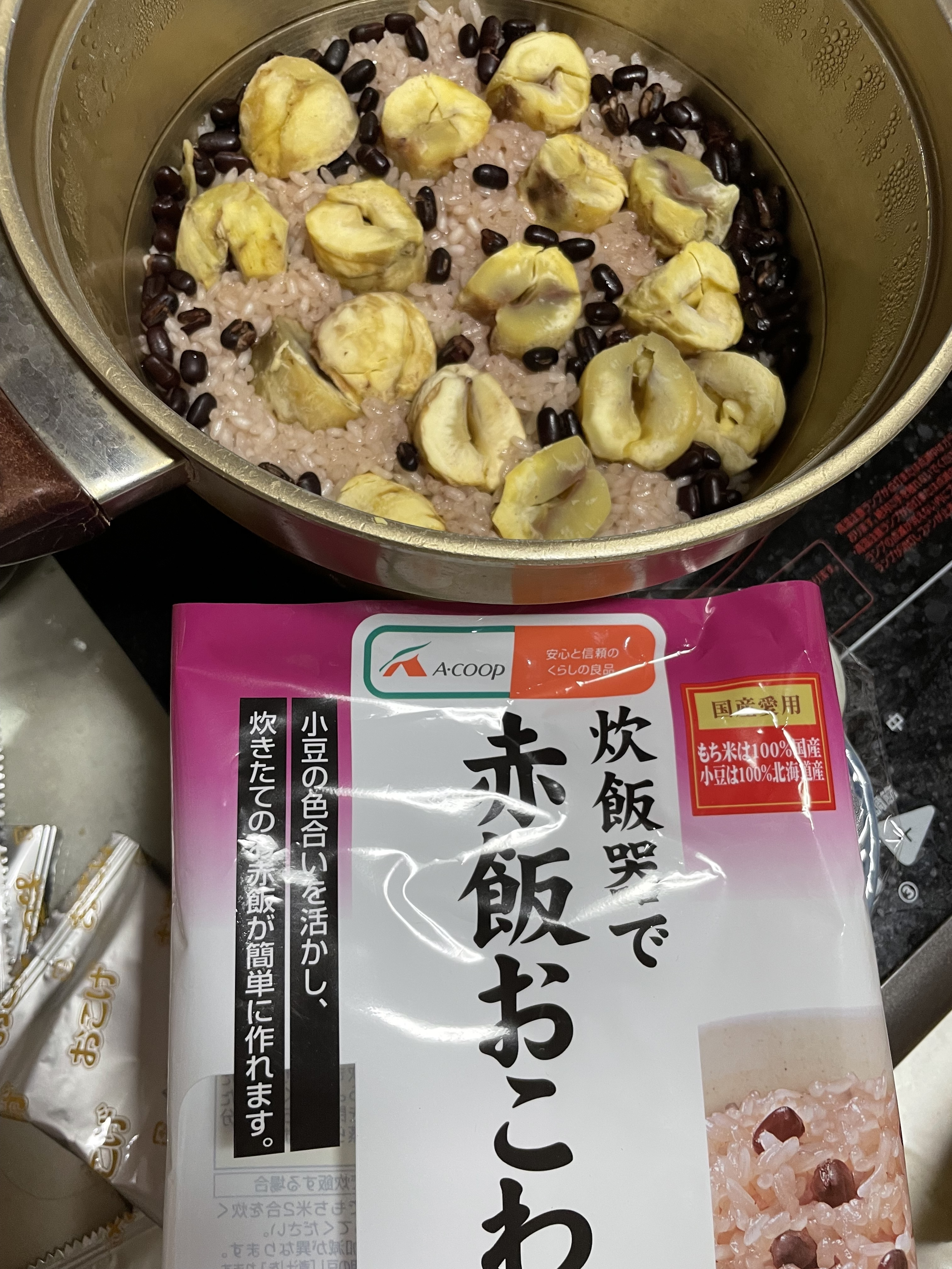 マーク品の赤飯おこわに栗🌰入れてスイッチポンと押しただけ😁