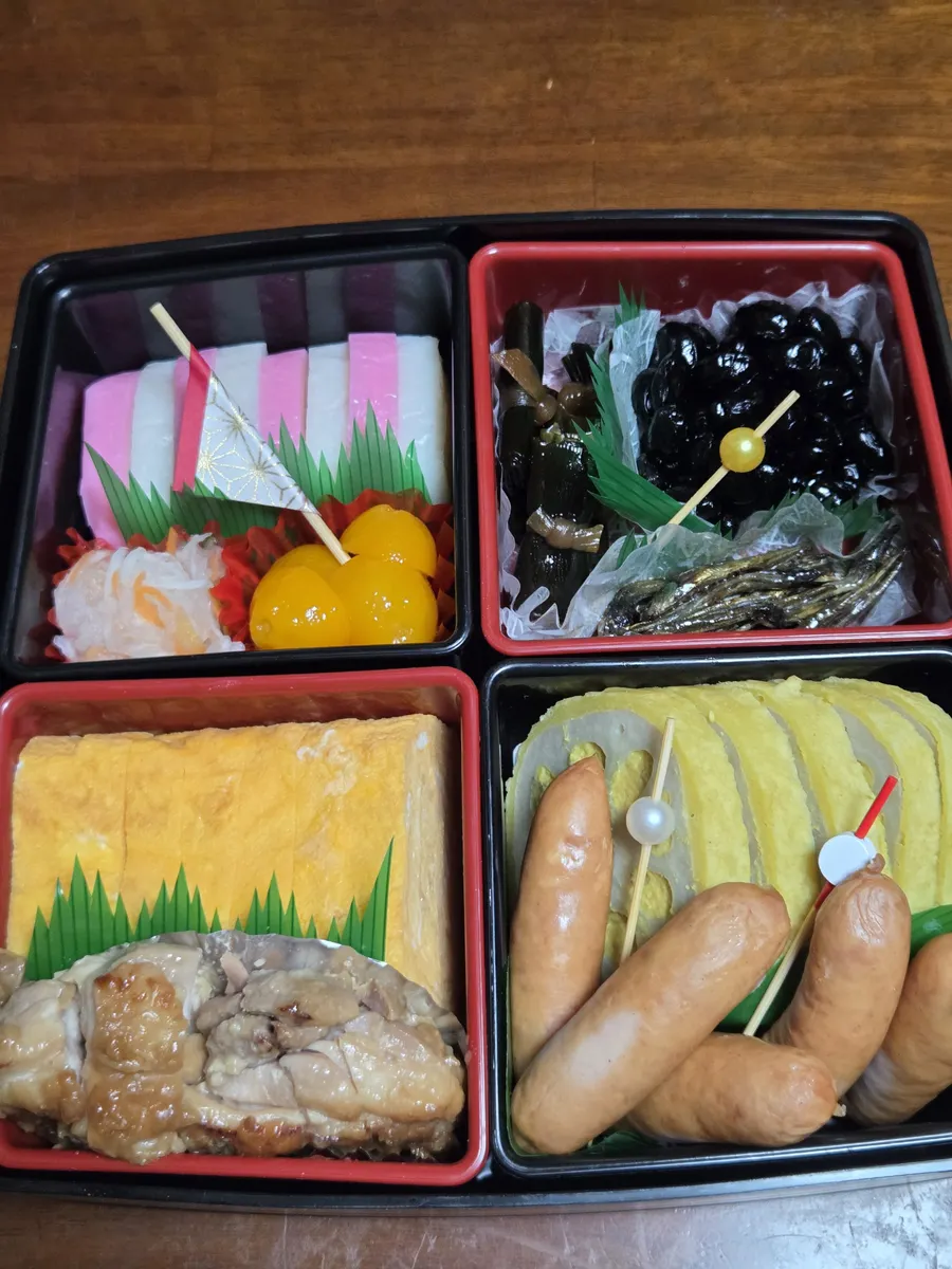 辛子蓮根も入ってて、ご当地おせちですね😊馬の絵は手書きですか❓