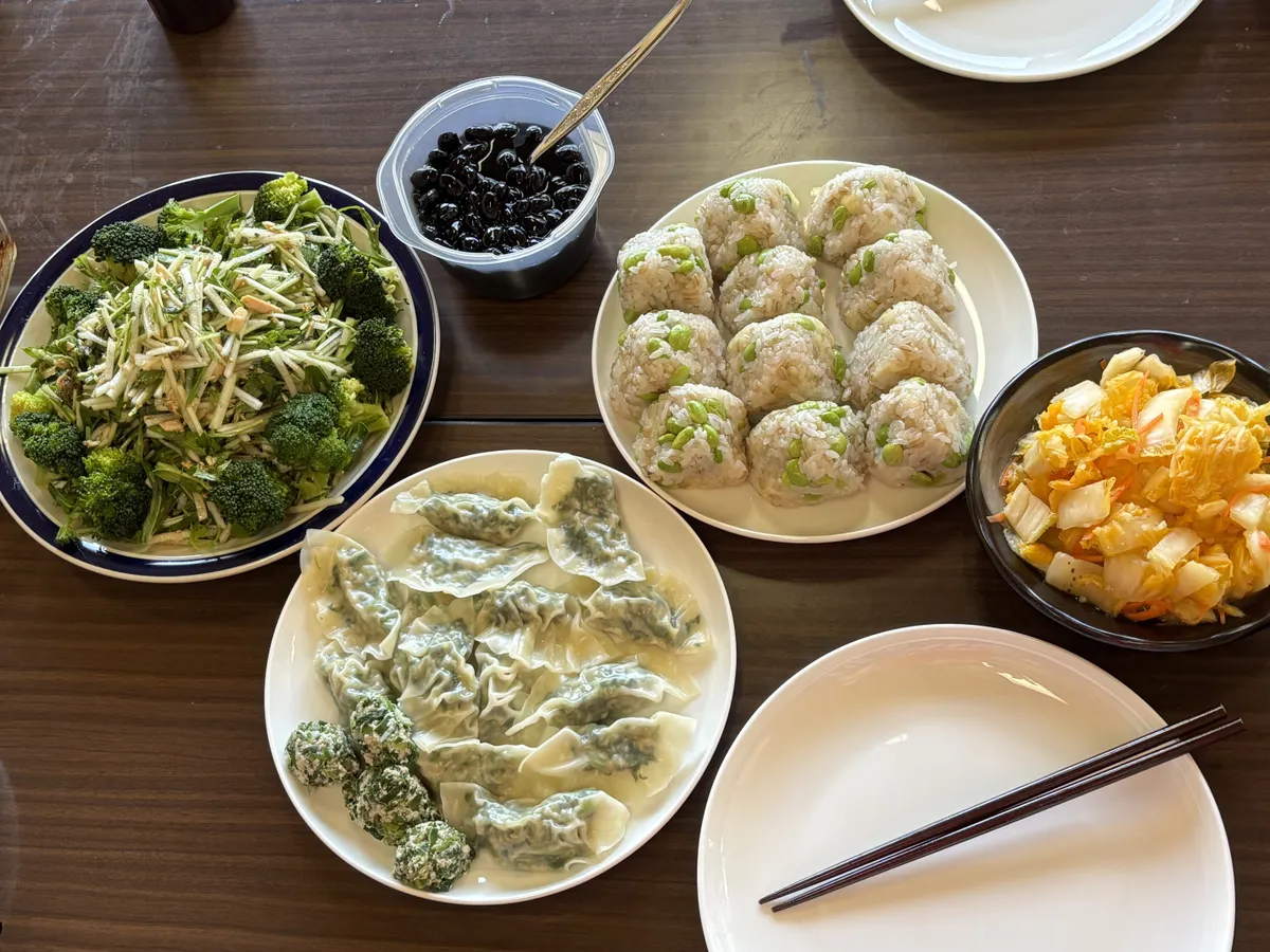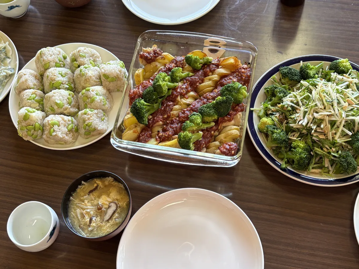 枝豆チーズが入ったもち麦ごはんのおにぎりも、きのこたっぷりかき玉味噌汁も美味しかった😆