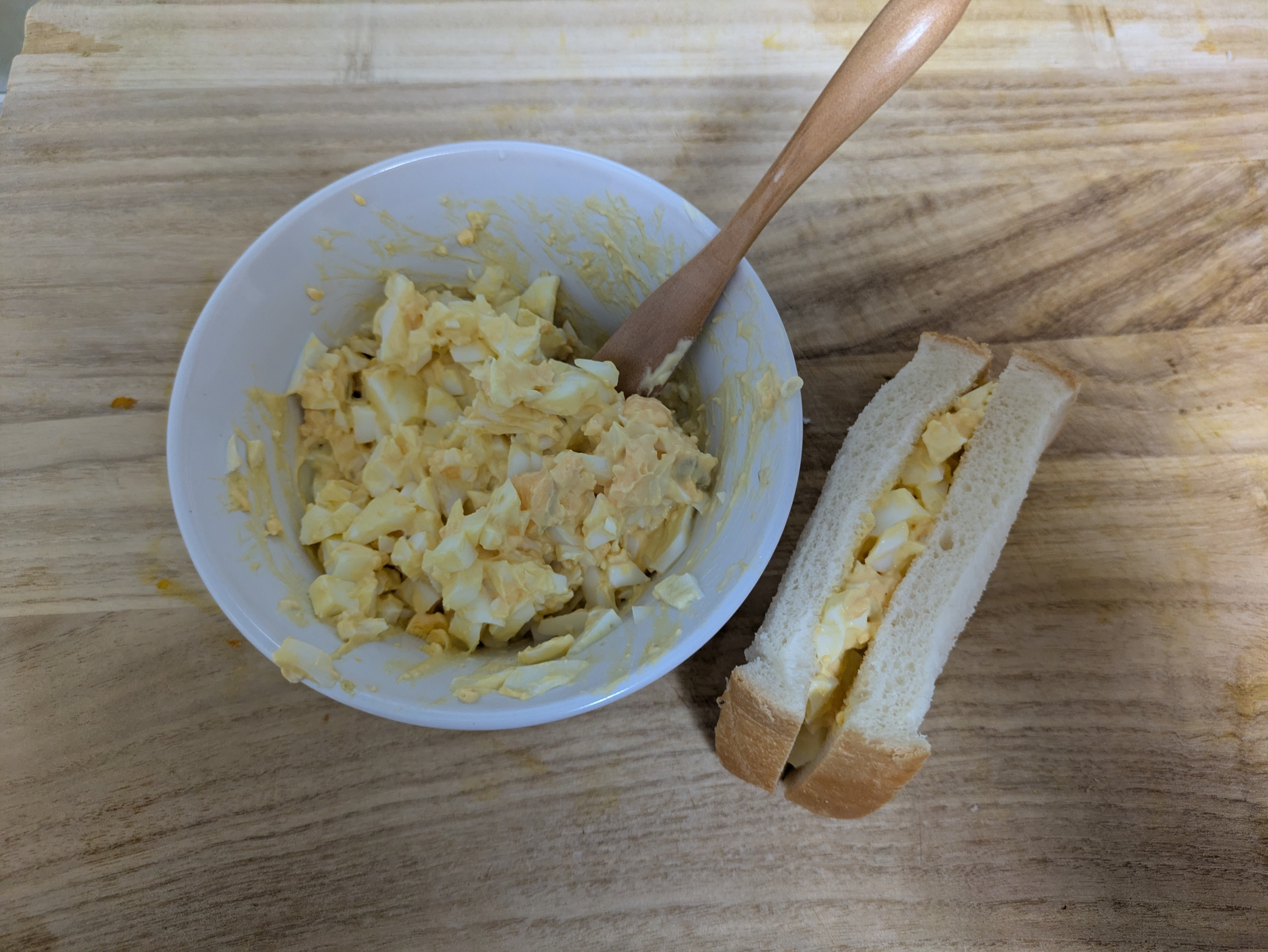 私は、ビニール製に茹でタマゴ、マヨネーズ、黒胡椒と味の素を少々加えてぐちゃぐちゃになるまでタマゴ潰して…ビニール製の端切ってパンに絞り出して作ります😂