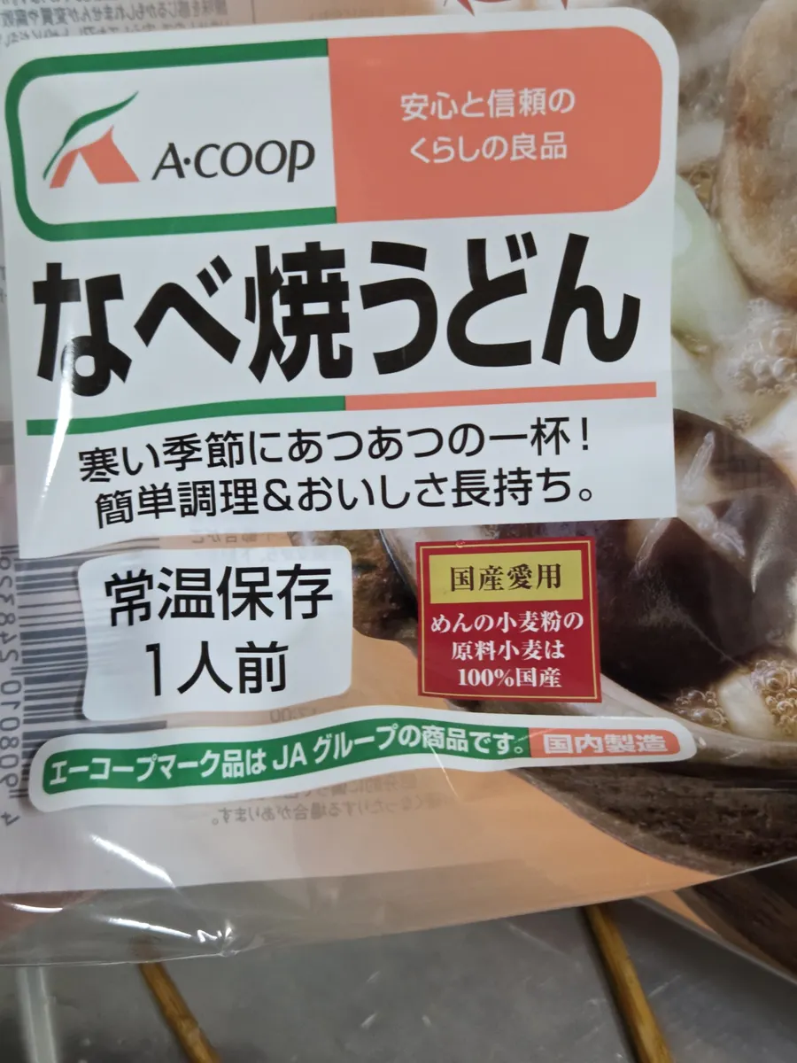 なべ焼きうどん、天ぷらとお麩が入ってるから、卵や冷凍野菜やきのこを入れて楽しみます。何もない時でも美味しいもの食べられるのっていいですよね😊