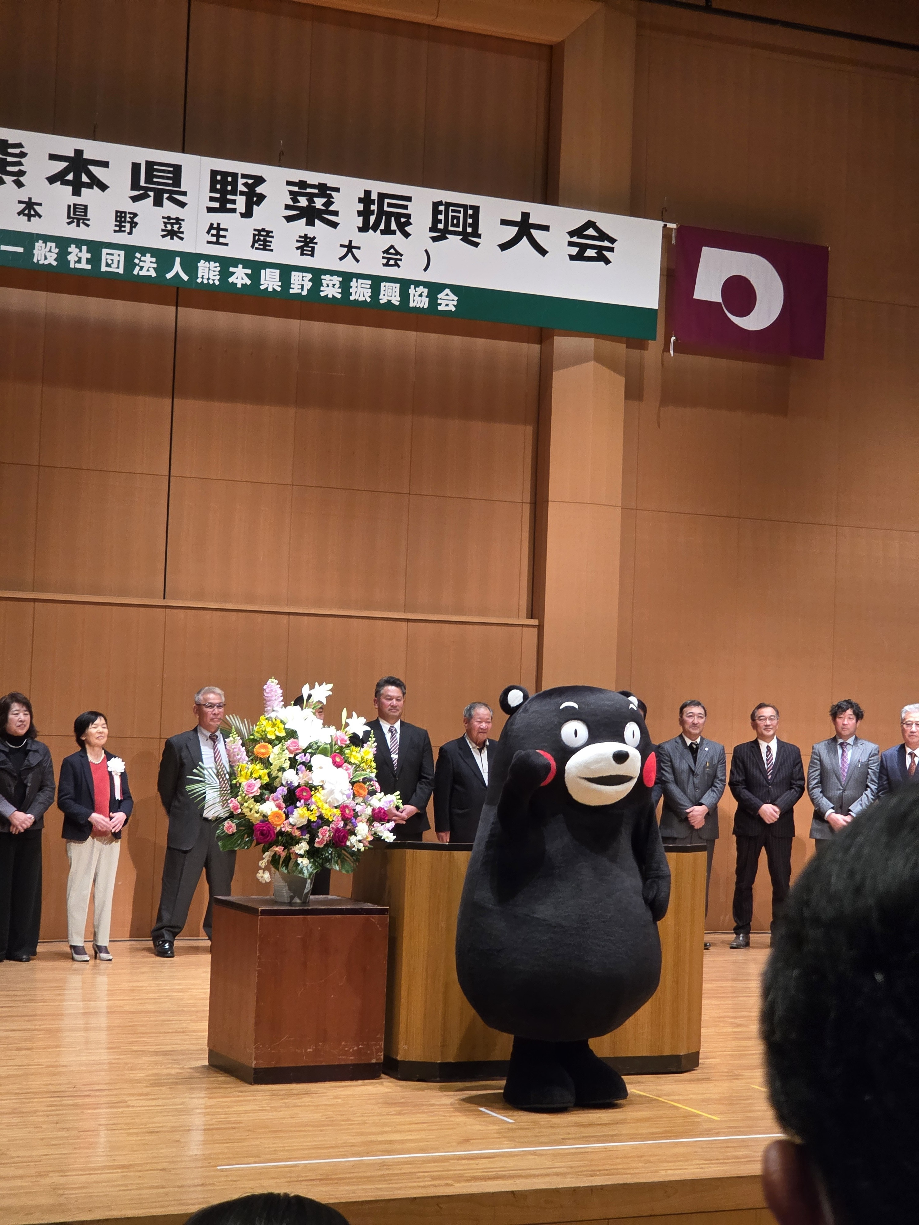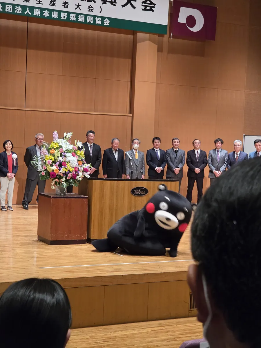 会の最後に、司会者より、「特別ゲストがお目見えです』と紹介されると、あのくまモンがステージに飛び出て来ました。