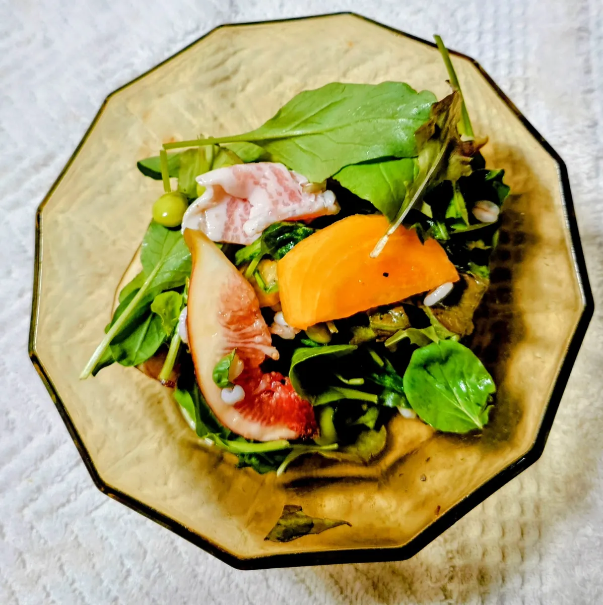 🍴太秋柿 イチジク 生ハム エダマメ(友人の栽培) ベビーリーフ のサラダ🥬