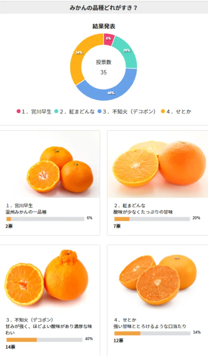 前回の「みかんの品種どれがすき?」では14票と「不知火(デコポン)」が1位という結果になりました!