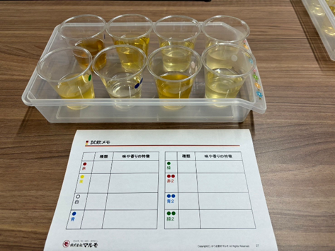 おだしの説明の後には、実際に8種類(かつお枯節、かつお荒節、煮干し、椎茸、さば節、焼きあご、昆布、顆粒だし)のおだしを飲み比べ、だしの種類を当てるクイズをしました。