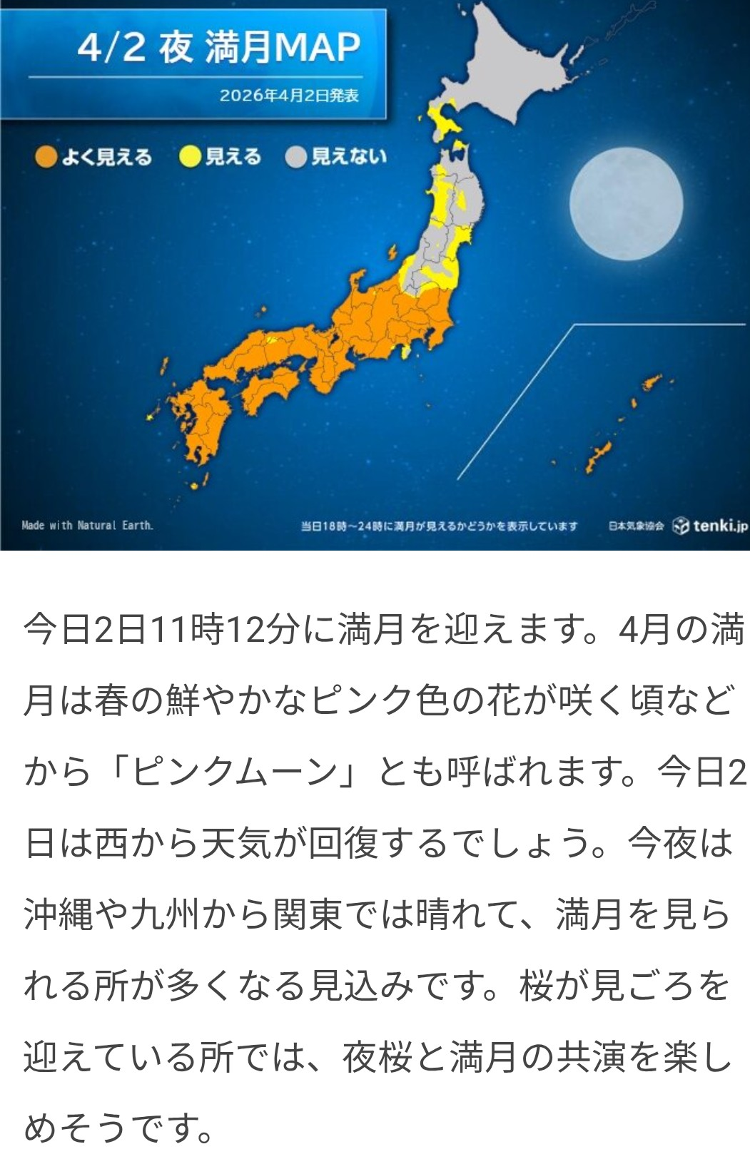 トップ > みんなのくらし《写真投稿》 > 今夜は…🌕️ ピー 2026/04/02 11:32 今夜は…🌕️ 皆さんのところ、雨☔大丈夫ですか?💦 こちらは朝方まで本降りの雨☔でした😓 今は雨☔も止み、これから強風予報😱 今夜は満月🌕️ この満月🌕️は「ピンクムーン」と呼ばれるそうです💕 なんて可愛いネーミング🤭 実際、ピンクに見えることはないそうですが😅 天気が良ければ夜、空眺めてみてください…いいことあるかも~✨✨✨ いいね 共有する 共有する X facebook LINE リンクをコピー コメントする 3 件の返信 (新着順) ミュートしたユーザーの投稿です。 投稿を表示 草取り名人 2026/04/03 05:47 ほんとうにピンクに見えるのかと思っていました なんか残念です それでも満月を見ると、なんか得した気持ちになれます。 いいね 返信する ミュートしたユーザーの投稿です。 投稿を表示 ピー 2026/04/03 09:40 草取り名人 満月🌕️には不思議なパワーがあります🤭 ちょっと嬉しくなりますよね😆 いいね 返信する ミュートしたユーザーの投稿です。 投稿を表示 農暁 2026/04/02 22:28 ピンク🩷に見えるわけではないのですね さっき見てて ピンクではないなぁ、と 目を凝らして見てましたよ笑😆 詳しくありがとうございます😊 いいね 返信する ミュートしたユーザーの投稿です。 投稿を表示 ピー 2026/04/03 09:35 農暁 そうなんですよ😅 本当にピンクに見えたら良かったのにね🤭 いいね 返信する ミュートしたユーザーの投稿です。 投稿を表示 ひとみ 2026/04/02 15:36 お天気は大丈夫そうです😊 見れるといいな〜 いいね 返信する ミュートしたユーザーの投稿です。 投稿を表示 ピー 2026/04/02 15:38 ひとみ 本当にピンクに見えたらいいのにね🤭🤭🤭 いいね 返信する