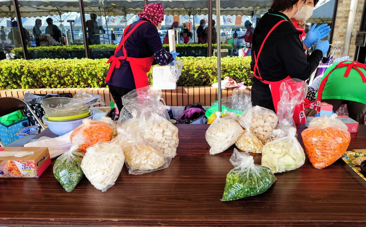JA女性部によります 豚汁200食の振る舞いの為の準備🎽 おそろいの 笑味ちゃんエプロン着用です。