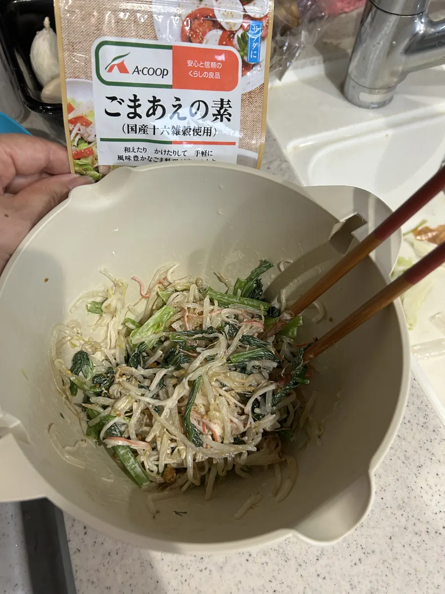 投稿を表示「もやしと小松菜とカニカマのマヨネーズに胡麻和えの素で風味アップ」