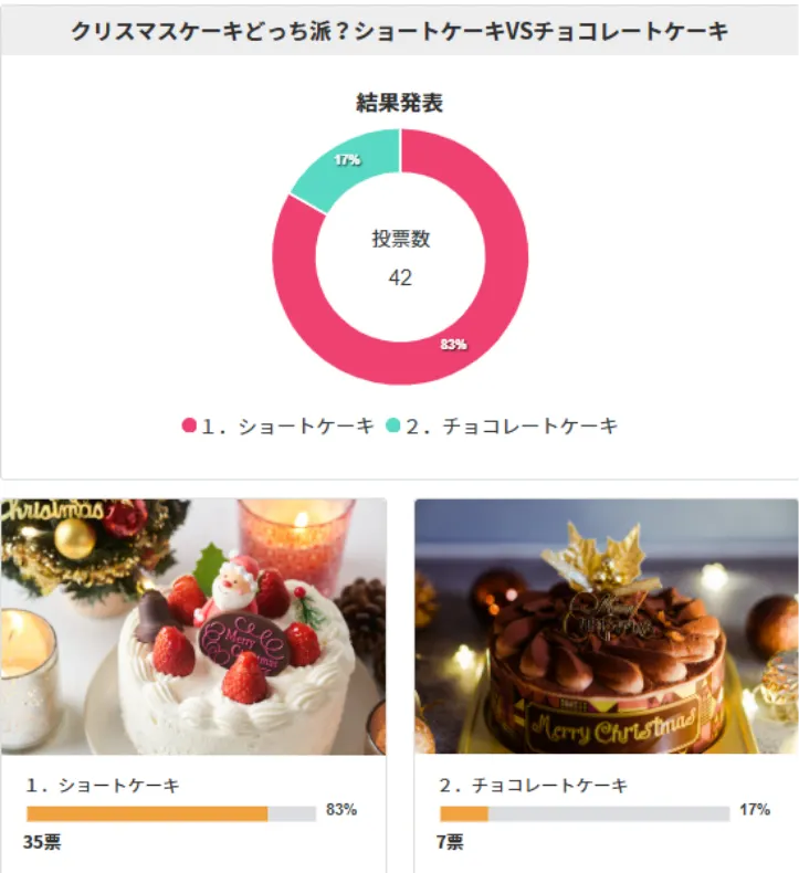」では35票と圧倒的に「ショートケーキ」を食べる方の方が多い結果になりました!(チョコケーキという方は7票でした!)