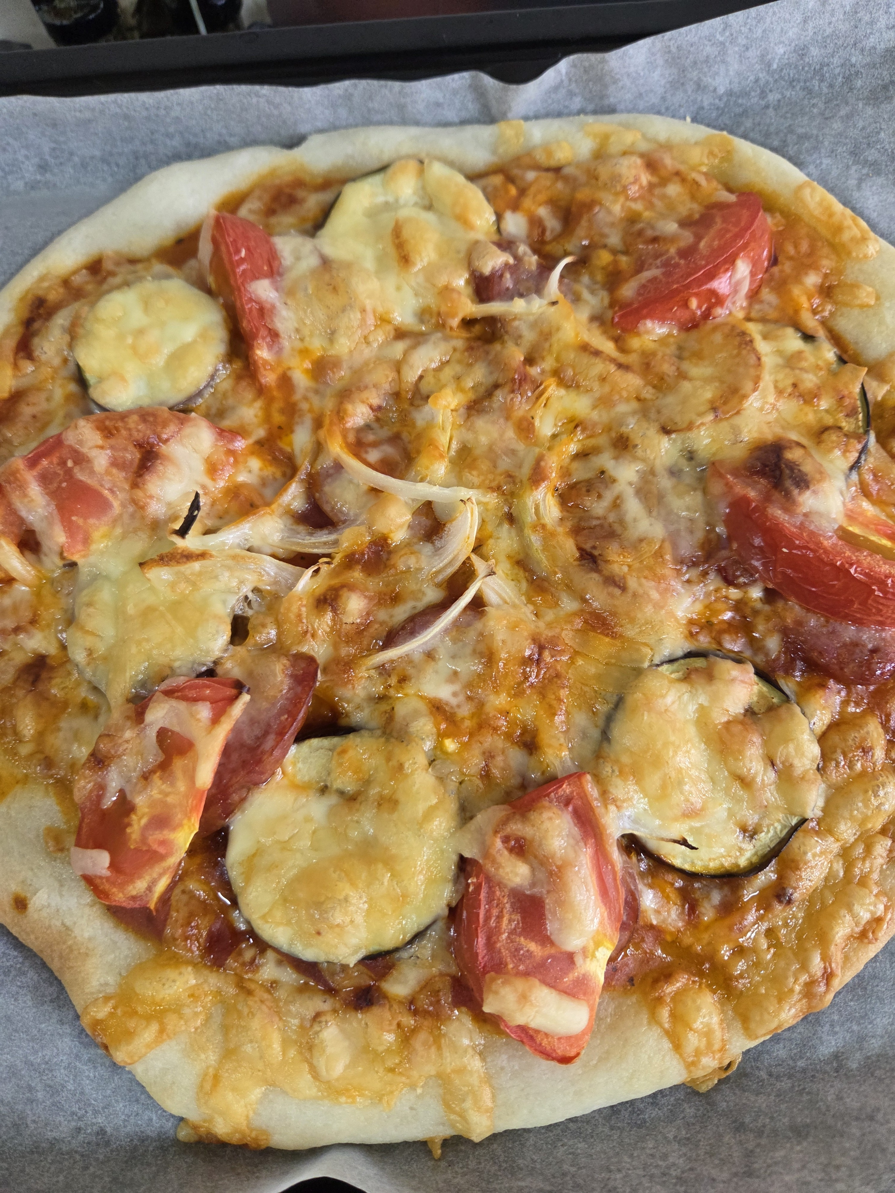投稿を表示トマト、ズッキーニ、玉ねぎ、ウインナーなどトッピングしたピザ🍕美味しそつなのができましたね。