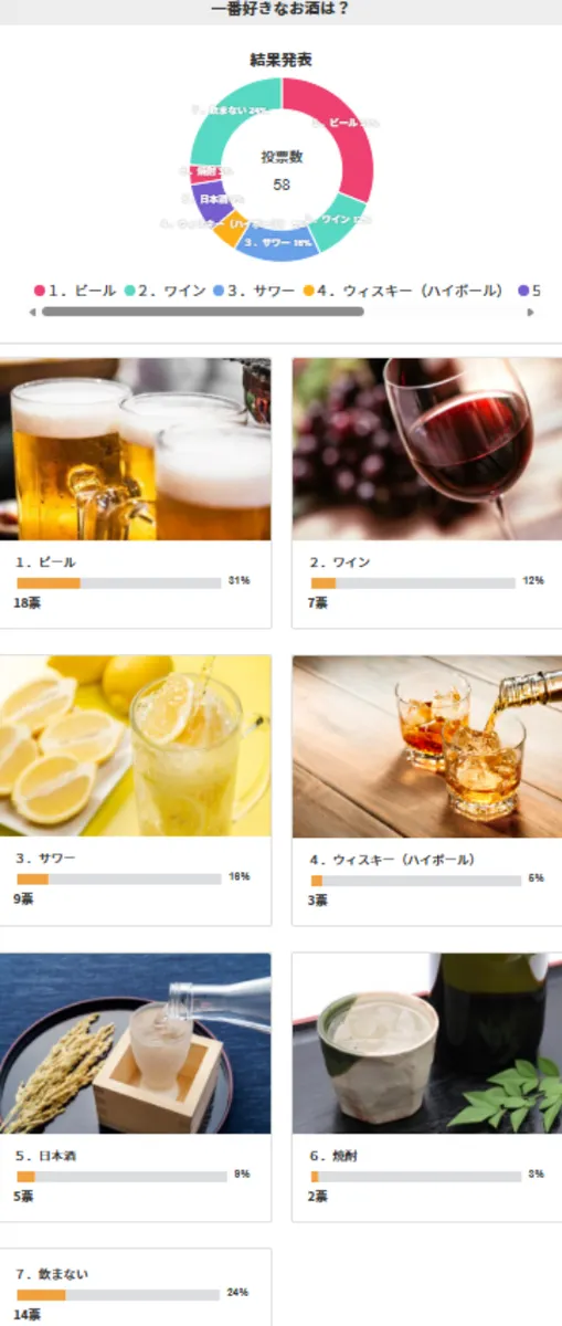 前回の「一番好きなお酒は?」では18票と「ビール🍻」が1位という結果になりました!以外にも飲まないという方も14票と多かったですね!