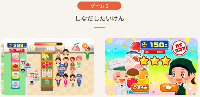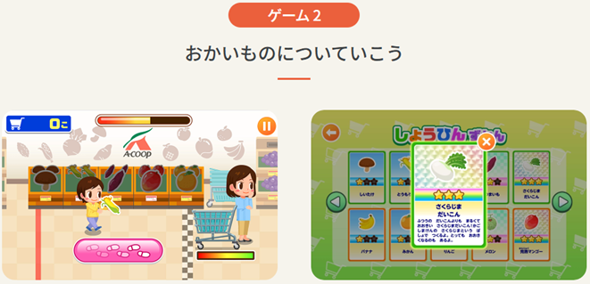 「Aコープのおかいものについていこう!」は、スーパーの品出しというお仕事を体験できる「しなだしたいけん!」と、スーパーでのお買い物を疑似体験できる「おかいものについていこう!」の2つのゲームで構成されています。