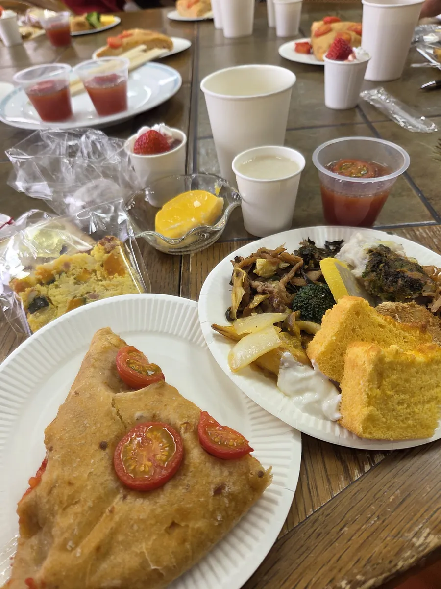 パン講師の方による地元農産物をつかったパン作りもあり、フォカッチャを作りました。フォカッチャが焼ける間、参加した食の名人さんたちがもちよった品々を披露。