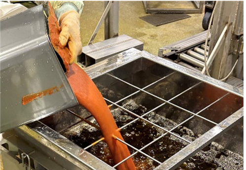 「原料のトマトピューレを投入する様子」