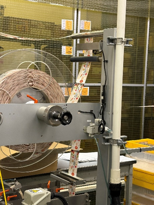 筒状のフィルムを容器にかぶせ、蒸気でシュリンクしていきます。