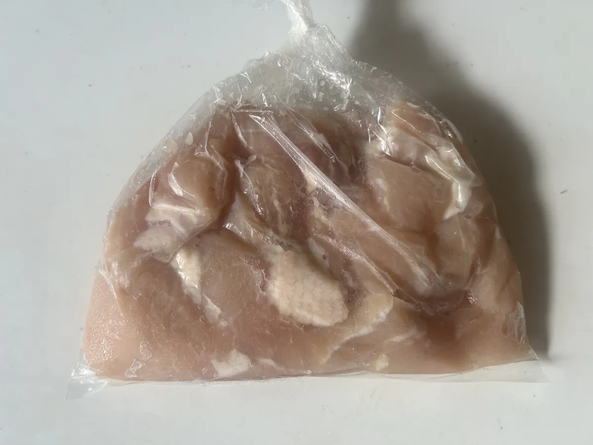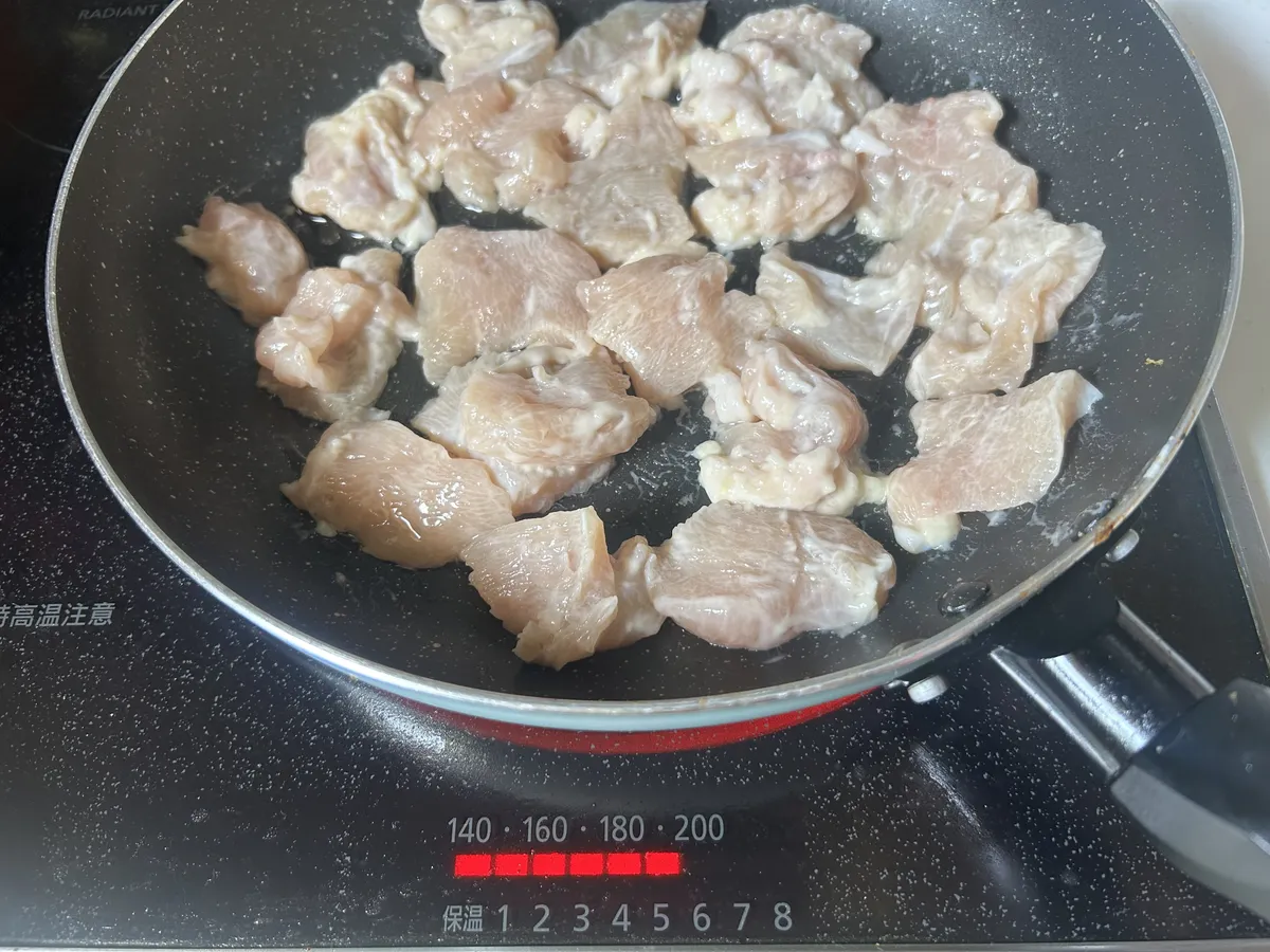 ①鶏むね肉はそぎ切りし、ポリ袋に入れ、塩こうじパウダーも入れて揉み込み、一晩、冷蔵庫へ。