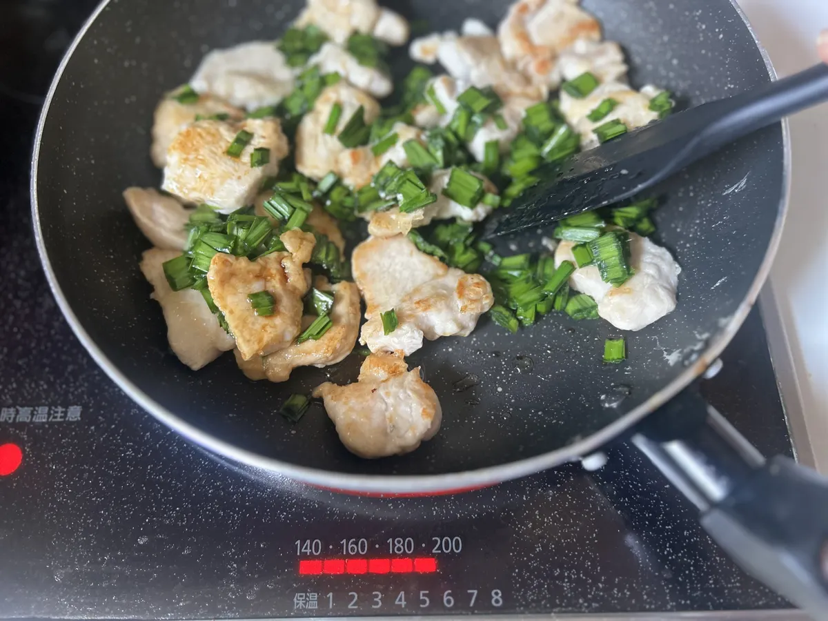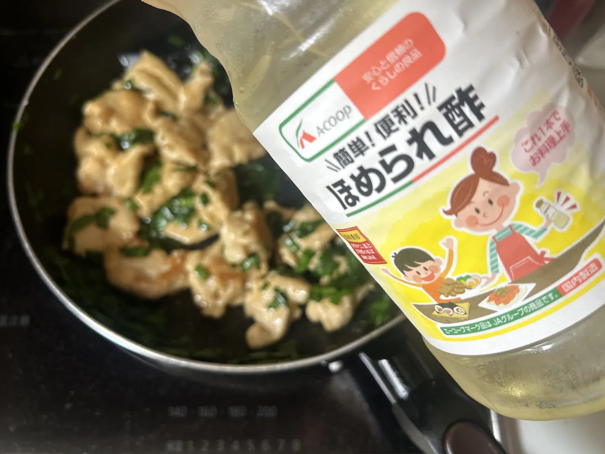 ④鶏むね肉に火が通ったら、1cm幅に切ったニラ、濃口しょうゆ、ほめられ酢を入れ、火を強め10秒ほど加熱し、できあがり。