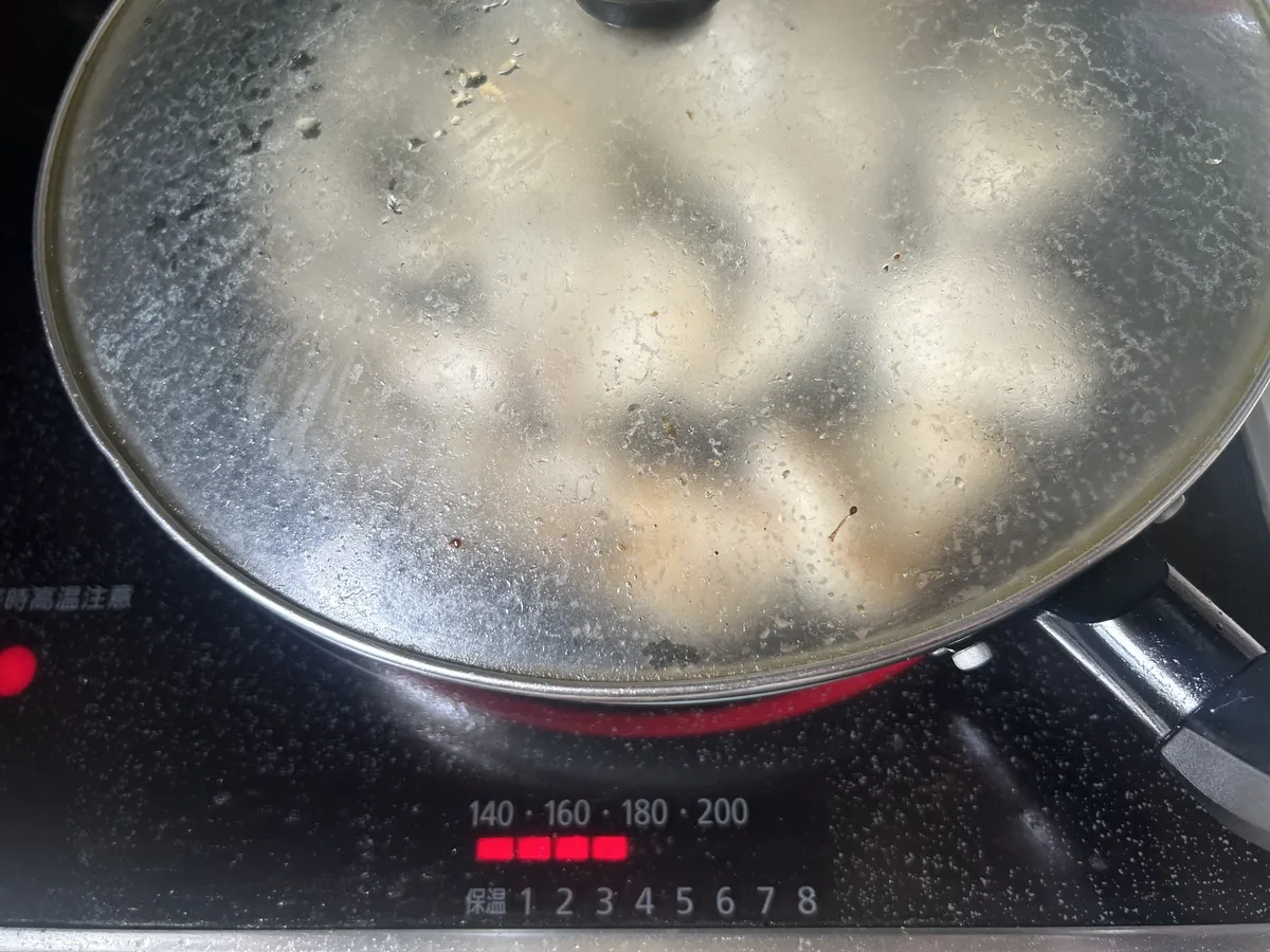 ③片面に焼き色がついたらひっくり返し、弱めの中火にし、蓋をして蒸し焼き。