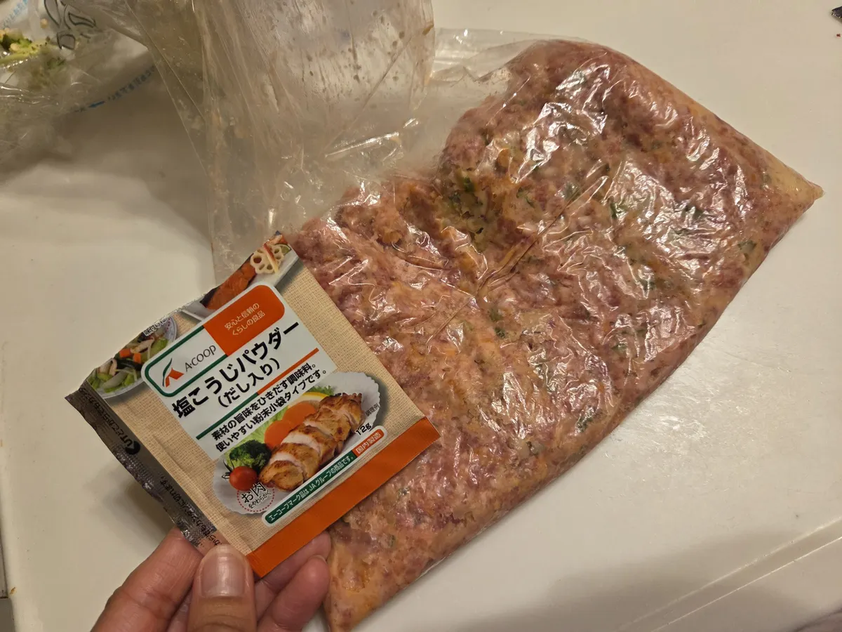 ⑤④にひき肉、①③、塩こうじパウダーを入れ、よく揉む。(袋が破れないように優しく)
