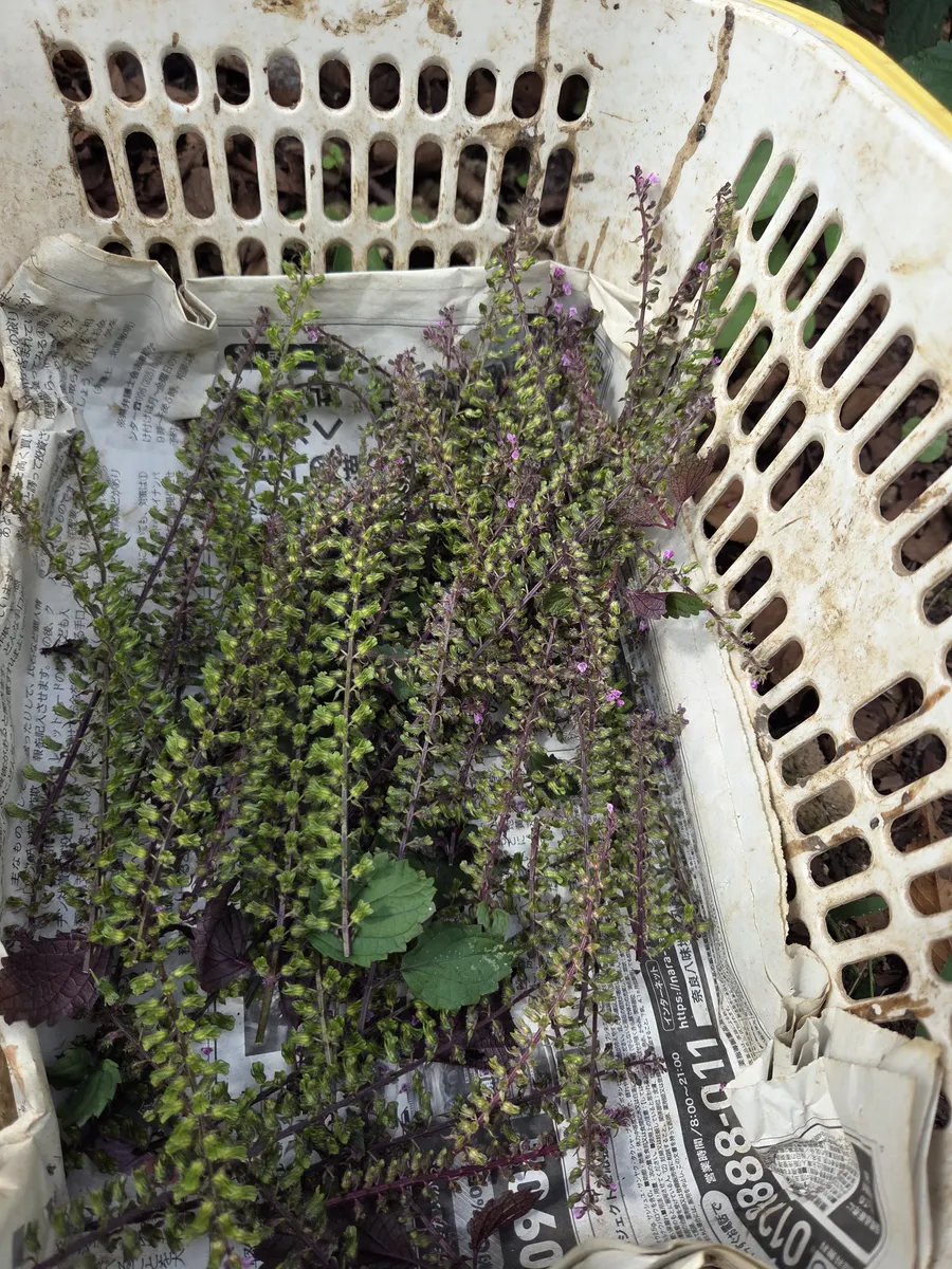 それに、ちょっと時期が遅くなり、日が当たるところはしっかり実になってしまっていたため、桜の木の下の影になるところがちょうどいいみたいだったので、そこの紫蘇の実を取ってきました