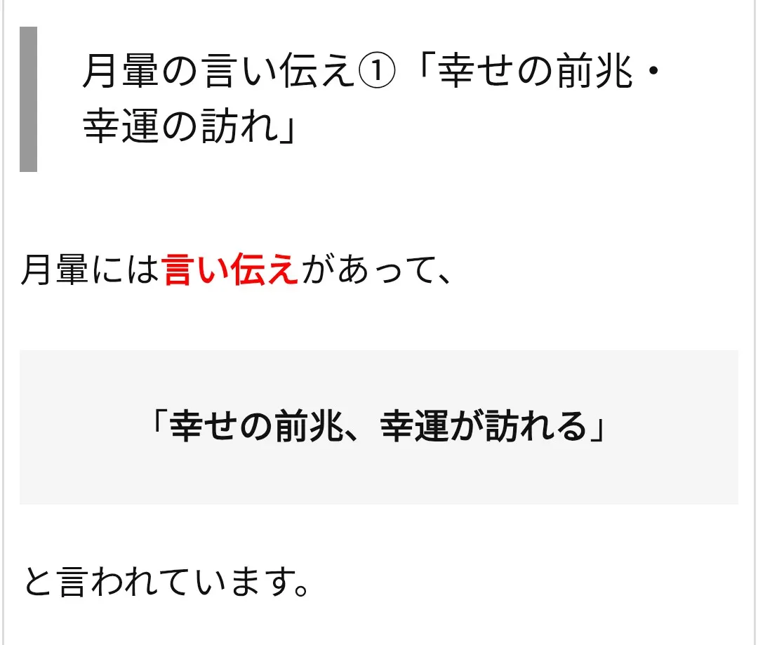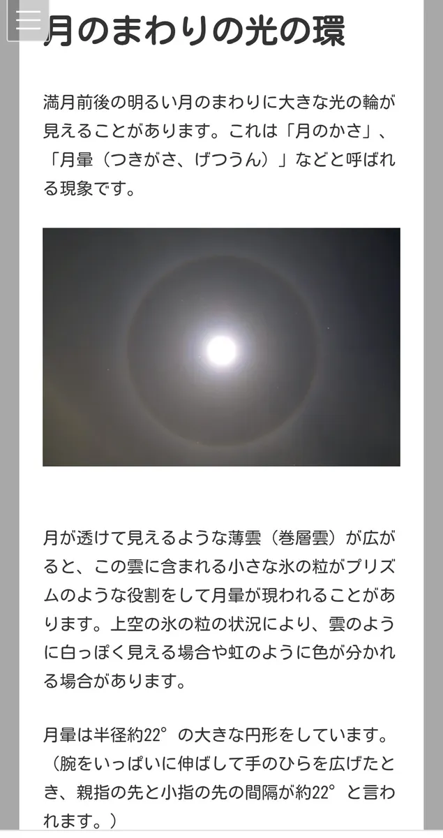 トップ > みんなのくらし《写真投稿》 > 現場レポート > 月のかさ🌕️ ピー 2025/12/05 20:15 月のかさ🌕️ 九州の皆さん、今夜は月🌕️見えてますかぁ?💦 こちらは、今👆️こんな感じです😅 皆さん、「月のかさ」って知ってますかぁ?💦 満月🌕️前後の月の周りに大きな輪があるの気付いてましたか?💬 私は数年前に気付いて「なんだろう??💦」ってとても不思議で調べました🤭 答えは「月のかさ」でした😳 名前がついていることにもビックリ👀😅 それから満月🌕️前後は月を見るのがちょっと楽しみになりました🤭 必ずしも見えるわけではありませんが…😥 皆さんも満月🌕️前後、ちょっと気にして見てみてくださーい‼️😆 いいね 共有する 共有する X facebook LINE リンクをコピー コメントする 7 件の返信 (新着順) ミュートしたユーザーの投稿です。 投稿を表示 kuma 2025/12/07 12:02 綺麗ですね~ つきのかさ、初めて聞きました。 いいね 返信する ミュートしたユーザーの投稿です。 投稿を表示 ピー 2025/12/07 12:50 kuma 満月🌕️前後、ちょっと気にして見てみてください😅 いいとこあるかも🤭🤭🤭 いいね 返信する ミュートしたユーザーの投稿です。 投稿を表示 だんご 2025/12/06 05:49 何かいいことが訪れますね♪ いいね 返信する ミュートしたユーザーの投稿です。 投稿を表示 ピー 2025/12/06 08:26 だんご ですね🤭 いいね 返信する ミュートしたユーザーの投稿です。 投稿を表示 ひとみ 2025/12/06 05:45 昨日は大きなお月さま見れました🌕 私は夜が弱いので、あまり外にも出ませんが、日が落ちるのが早くなってまだ18:30くらいだったのに、もうこんな大きなお月さま見えるね〜って娘と話しながら家に帰りました😊 いいね 返信する ミュートしたユーザーの投稿です。 投稿を表示 ピー 2025/12/06 08:02 ひとみ 最近は17時過ぎるともう星空が見え始めます✨ もうすぐ冬至だからだんだん夜が長くなるね🌙✨ そしてもうすぐ流星群🌠 今回は時間が早いから娘さん達と観れると思うよ🤭 いいね 返信する ミュートしたユーザーの投稿です。 投稿を表示 ミケッチ 2025/12/05 23:18 今夜も冷ますね〜。 月がキレイに見えています。 いろんな場所で同じ月を見てるんですね~☺️ 今朝はメダカの鉢に氷が張っていましたが明日の朝はどうでしょう? いいね 返信する 他 1 件の返信を表示 ミュートしたユーザーの投稿です。 投稿を表示 ピー 2025/12/06 07:58 ミケッチ 最近は冷え冷えの状態が続いてますね😱 今朝も凍るほどの寒さ💬 一枚余計に着込んでしまった😅 氷の下でメダカは元気に泳いでる?💦 いいね 返信する ミュートしたユーザーの投稿です。 投稿を表示 ミケッチ 2025/12/06 08:24 ピー メダカ、昼間だけ浮いてきます。 大きいのはアライグマに食べられてしまって、今年生まれた子だけになってしまいました😢 いいね 返信する ミュートしたユーザーの投稿です。 投稿を表示 ピー 2025/12/06 09:38 ミケッチ アライグマ🦝?💦 あー、かわいそうに😱😓 でも…自然の摂理だから仕方ないね😱 子供がクスクス育ってまた、どんどん増えるよ🤭 いいね 返信する ミュートしたユーザーの投稿です。 投稿を表示 ひつじちゃん 2025/12/05 22:42 つきのかさ ってあるんですね。 私は単に目が悪いからかなと 思ってました。ありがとうございます😊 いいね 返信する ミュートしたユーザーの投稿です。 投稿を表示 ピー 2025/12/06 07:55 ひつじちゃん ひつじちゃん、おもしろい😂😂😂 目の錯覚じゃありませんよ😅 いいね 返信する ミュートしたユーザーの投稿です。 投稿を表示 ちはる 2025/12/05 21:45 満月見えてますよ😊 外がお月様で明るい感じがします✨ 明日の朝は冷えそうです🥶 月のかさという名前とは知りませんでした いいね 返信する ミュートしたユーザーの投稿です。 投稿を表示 ピー 2025/12/05 22:13 ちはる 見れて良かったね💕 名前がついてたなんてビックリだよね🤭 いいね 返信する ミュートしたユーザーの投稿です。 投稿を表示 こきよみ 2025/12/05 20:24 ピーさん!見えましたよ! とてもきれいなお月様🌕ですね! 『月のかさ』知ってますよ 見たことあります🌕 いいね 返信する ミュートしたユーザーの投稿です。 投稿を表示 ピー 2025/12/05 20:26 こきよみ 知ってる人がいましたね🤭 今夜は見えて良かった良かった🥳 いいね 返信する