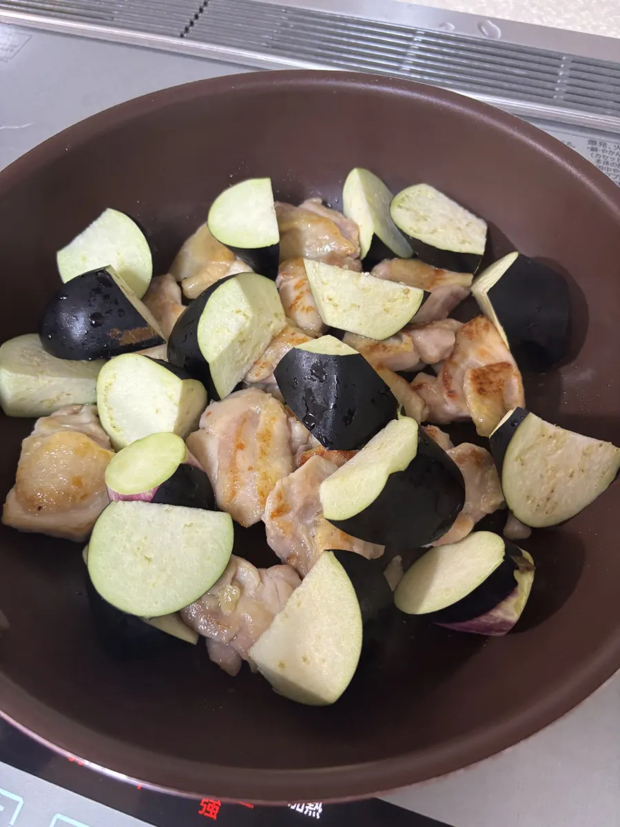 ② 中火で軽く焼き目がついたら裏返して、水気をきったナスを入れて蓋をする。中弱火で5分蒸し焼きにしたら一度混ぜてからナスが柔らかくなるまで5〜10分くらい蒸し焼きにする。
