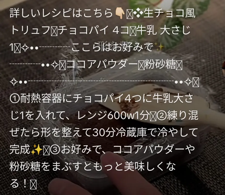 トップ > みんなのくらし《写真投稿》 > レシピ投稿 > チョコパイが…👀😳🍫 ピー 2026/02/10 11:00 チョコパイが…👀😳🍫 一昨日、コープ店で買ったチョコパイ🤭 何に変身したと思いますか?💬 👆️、何に見えますか?💦 入れ物がいいでしょ⁉️ (前回買ったルタオの入れ物😆) 入れ物がいいとそれなりに見えるから不思議😂😂😂 黙って出されたら「生チョコ🍫」 疑いもせずに食べる😆 知っているとちょっと微妙だけど… チョコパイなので違和感なし😅 材料👇️、超 💭簡単💭💭 作り方👇️ いいね 共有する 共有する X facebook LINE リンクをコピー コメントする 11 件の返信 (新着順) ミュートしたユーザーの投稿です。 投稿を表示 ひろさきあゆ 2026/02/11 17:20 チョコパイだったなんて 気づかない わぉわぉ 完全に生チョコだ〜〜🍫🍫🍫🍫🍫 いいね 返信する ミュートしたユーザーの投稿です。 投稿を表示 ピー 2026/02/11 18:46 ひろさきあゆ 言われても気づかないかも😅😂 いいね 返信する ミュートしたユーザーの投稿です。 投稿を表示 kuma 2026/02/11 13:15 簡単なので作ってみたくなりますね。 いいね 返信する ミュートしたユーザーの投稿です。 投稿を表示 ピー 2026/02/11 13:58 kuma でしょ⁉️😅 なので…作ってみました😆 いいね 返信する ミュートしたユーザーの投稿です。 投稿を表示 ちはる 2026/02/11 09:55 すごーい🥰 美味しそうですね💓 いいね 返信する ミュートしたユーザーの投稿です。 投稿を表示 ピー 2026/02/11 10:41 ちはる 簡単、簡単😆 作ってみてみて🤭 いいね 返信する ミュートしたユーザーの投稿です。 投稿を表示 たんぽぽ 2026/02/11 09:32 すごいですね👏 公式レシピじゃなくて、考えたやつですか? 食べてみたいです😊 最近チョコパイ自体買えてない… 新しいチョコパイも気にはなってますが… いいね 返信する 他 1 件の返信を表示 ミュートしたユーザーの投稿です。 投稿を表示 ピー 2026/02/11 10:42 たんぽぽ これは、動画で気になったレシピです😅 簡単に作れてちょっと気になるでしょ⁉️😂 いいね 返信する ミュートしたユーザーの投稿です。 投稿を表示 たんぽぽ 2026/02/12 15:36 ピー なるほど! 沢山動画ありますよね😆 作ってみて感動級の美味しさならリピートしちゃいます😊簡単なら尚更🩷 いいね 返信する ミュートしたユーザーの投稿です。 投稿を表示 ピー 2026/02/12 18:37 たんぽぽ 感心するほどたくさんあるよね😳🤭 自分で簡単に作れそうだと思うと作ってみたくなっちゃう😅 いいね 返信する ミュートしたユーザーの投稿です。 投稿を表示 ミケッチ 2026/02/11 09:09 なぜチョコパイが生チョコに?🤔🤔🤔 元がチョコパイだから美味しいんでしょうけど😄 いいね 返信する ミュートしたユーザーの投稿です。 投稿を表示 ピー 2026/02/11 10:43 ミケッチ そうなの🤭 不思議だよね😳💦 チョコパイだから味は🆗✌️ いいね 返信する ミュートしたユーザーの投稿です。 投稿を表示 こきよみ 2026/02/11 08:28 チョコパイが生チョコになったんですね! 黙って出されたら、生チョコですね! 作ってみようかなぁ😋 いいね 返信する ミュートしたユーザーの投稿です。 投稿を表示 ピー 2026/02/11 10:44 こきよみ 凄く簡単😆 しかも材料費安く済むし🤭 いいね 返信する ミュートしたユーザーの投稿です。 投稿を表示 草取り名人 2026/02/11 07:00 これはもう、手品です 凄いです いいね 返信する ミュートしたユーザーの投稿です。 投稿を表示 ピー 2026/02/11 10:45 草取り名人 ねー💦 不思議ですよね🤭 いいね 返信する ミュートしたユーザーの投稿です。 投稿を表示 きっしー 2026/02/10 23:03 全然わからないですね。 簡単そうなので私も作ってみたいです。 情報有り難うございます😋 いいね 返信する ミュートしたユーザーの投稿です。 投稿を表示 ピー 2026/02/11 10:45 きっしー 本当、凄く簡単です😅 いいね 返信する ミュートしたユーザーの投稿です。 投稿を表示 ひとみ 2026/02/10 21:03 もとがチョコパイには見えませんね😆 いいね 返信する ミュートしたユーザーの投稿です。 投稿を表示 ピー 2026/02/10 22:14 ひとみ でしょ⁉️😅 ハイって渡されて食べたら疑いもなく生チョコ🍫😂😂😂 材料少なくて楽に出来るのいいよね🤭 いいね 返信する ミュートしたユーザーの投稿です。 投稿を表示 りんごばーば 2026/02/10 16:36 目から鱗🤭🫠 いいね 返信する ミュートしたユーザーの投稿です。 投稿を表示 ピー 2026/02/10 17:03 りんごばーば 😂😂😂 いいね 返信する もっと見る