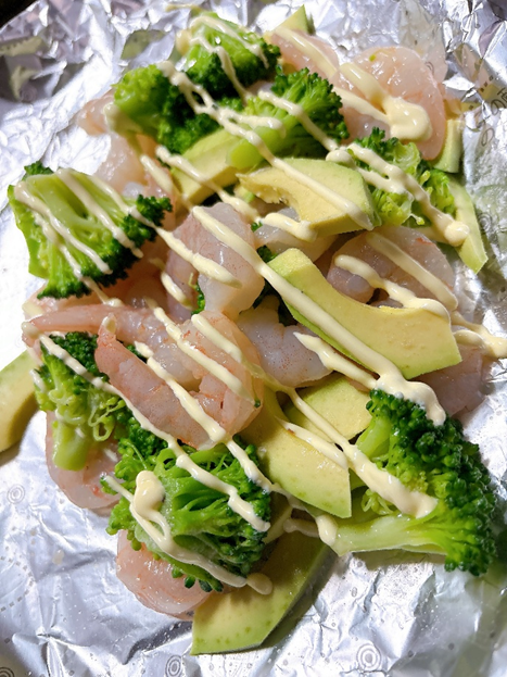 3.アルミホイルにエビ・ブロッコリー・アボカドを入れ、塩こうじパウダーをかけて和える。
