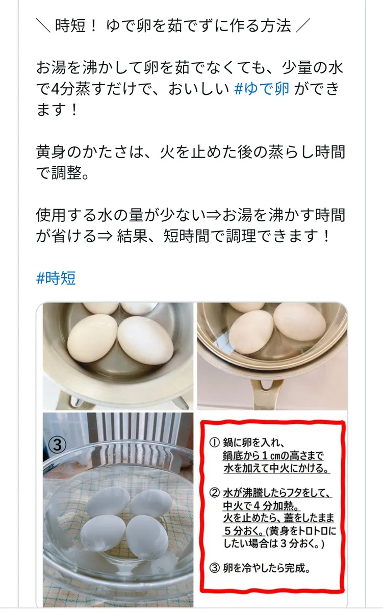投稿を表示少ない水でゆで卵できるんですね!