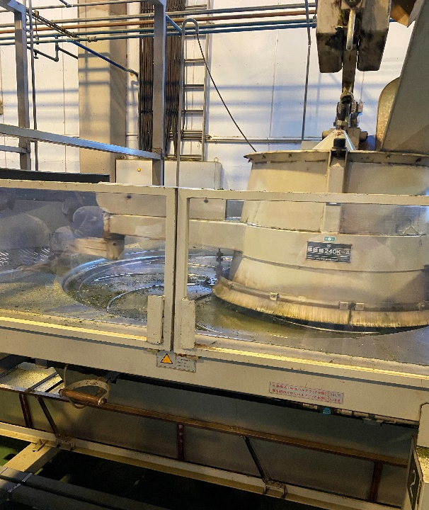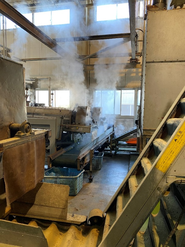 その後、生の茶葉を高熱の蒸気で蒸して揉むことで、生葉の中の水分を出し、熱風で乾かして水分量を少なくしていきます。