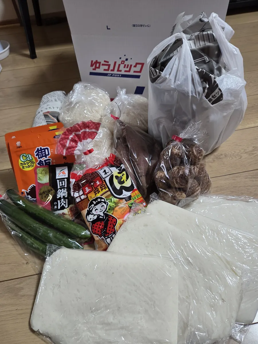 左の新聞紙で包んだものはだいこん、右の上袋に入ったものは白菜です。あと、きゅうりに里芋からいもはうちで取れたもの。南関揚げに五木のうどんは欠かせません。うどんは孫一号の大好物。