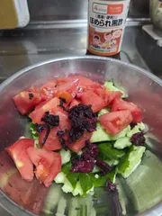 早取りひじき ほめられ黒酢でいただきます👀 JA食材できた 長崎産早取りひじきをほめられ黒酢でいただくことに☺️ 生で食べるのは初めて😅 下に素麺こんにゃく ひじき トマト🍅 きゅうり🥒で。「 あ…生は磯の味が強いな😅と (2人話しながら) 全部を混ぜごぜすると食べやすいよ🎶」と食べ比べ☺️ 「ほめられ黒酢はやっぱり美味しいね」の結