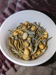 子供のおやつに❣大人はおつまみに❣ 乾燥のいりこと大豆を乾煎りして、油とお砂糖でカラメたら、最後にほめられ黒酢を回しがけして出来上がり❢カンタンです❣