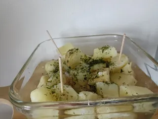 ふりふりポテト 【材料(分量付き)】・じゃがいも×3個・塩こうじパウダー×3~5回振る(またはお好み)・青のり(お好みの量)・オリーブオイルまたはごま油など(適量) 【作り方(使用した塩こうじパウダーの量とタイミング等、手順をわかりやすく)】①じゃがいもを食べやすいサイズにカットして4~5分レ