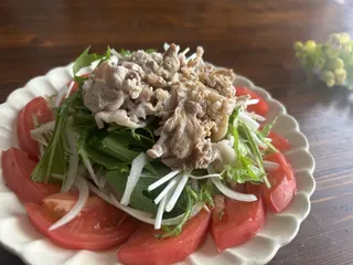 豚しゃぶ入りの中華サラダ 塩こうじパウダーが、タレの隠し味に✨お肉と生野菜の、ボリュームサラダ〜 【材料】豚こま切れ肉(100g)水菜(50g)玉ねぎ(1/4個)トマト(1玉)〜タレ〜塩こうじパウダー(大さじ1/2)濃口しょうゆ(大さじ1)ごま油(大さじ1)酢(大さじ1) 【作り方