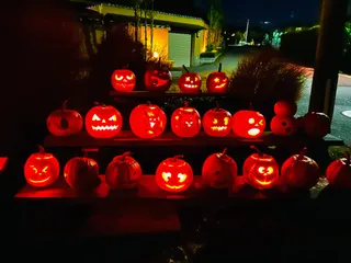 ハロウィン 毎年恒例ご近所さんのハロウィン🎃です。毎年楽しませて頂き感謝🎃 今年は猛暑の影響でカボチャがダメになったり大変だったらしい。それでも、彫刻も毎年こっていて、思わず見惚れてしまった💕