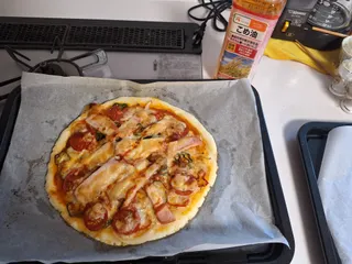 明けましておめでとうございます🎍 おせち料理食べましたが、今日はジャンクフードが食べたくなり、でもちょっと身体のことも気にして米粉とお豆腐で発酵無しでもOKの米粉ピザ作りました🙆いつか使うだろうと買っていた米粉とエーコープマーク品のこめ油とお豆腐とベーキングパウダーなので、気分的も身体に良