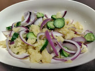 塩こうじポテトサラダ 【材料 じゃがいも2個、きゅうり1本、青玉ねぎ4分1、塩こうじパウダー小袋、豆乳マヨ適量】 【作り方(じゃがいもをレンジで5分温める、皮を剥いて潰す、この時に塩こうじパウダーを投入ひたすら混ぜる、豆乳マヨをお好みで入れる、切ったきゅうり、赤玉ねぎを加えて出来上がり】 【家にあった