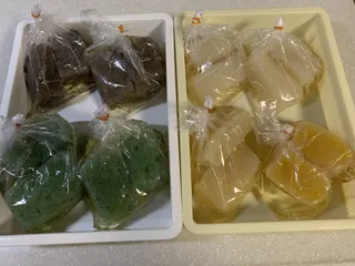 JA女性部の仲間で"こんにゃく"を作りました。味は、柚子、青のり、ヒジキ、プレーンの4種類プルプルでとても美味しい😋んです。Aむすびの皆さんも作っておられるとは思いますが・・・投稿します。柚子味青のり味茹でて・・・よ〜く冷ましたら・・・出来ました😃😃 煮汁と共に袋に入れて冷蔵庫で保存します