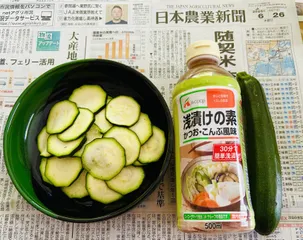 浅漬け JA女性部の懇談会で、Aコープからの粗品として頂きました。早速ズッキーニを漬けて見ました。まだ胡瓜や茄子収穫出来ないから。