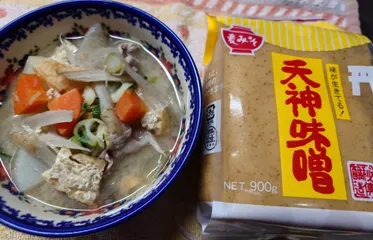 ❄️寒ーい今夜は豚汁🎵🎵 ここんとこ 寒いので具だくさんの豚汁を沢山作りました💕ごぼう 人参 大根 油揚げ に大好きなコンニャクも。里芋は今夜は不在です😅 味噌はJAの天神味噌󠄀🐰この味噌󠄀は共同購入で引張りだこ💓 Aコープには 板コンニャクもあるんですね~😍コンニャク大好きな私はしっかりと投入です。最近は 左の