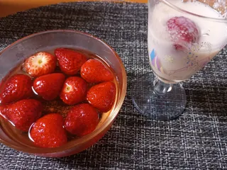🍓は1日以上経過すると少しづつ表面が…バナナとかも変色してきますね😅漬けた後の酢にやっぱり牛乳で飲みました😊最後にドライフルーツ混ぜます(フルーツ酢の使い回し笑)