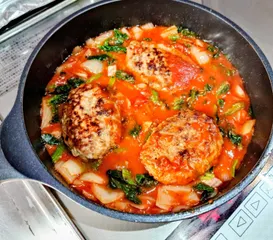ザクザクの玉ねぎ🧅 フルーツトマト🍅の水煮 トマトソース JA食材にプラスの野菜   そして この国産具材使用 ほうれん草&ベーコンミックスがお役立ちます😄 ハンバーグは何処に? 位にソースがたっぷり💓  お腹いっぱい