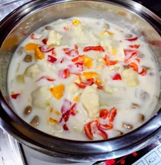 カリフラワーいっぱいのクリームシチュー🍲 先日の収穫祭で買った大きなカリフラワー☺️ これは 2個めです😁 じゃが芋の変わりに カリフラワー😄 人参🥕は無いので 赤と黄色のパブリカを お肉も無いので 着色無しのウインナーを 玉ねぎ🧅は さいの目に1杯 牛乳はたっぷり💓 緑は 残念